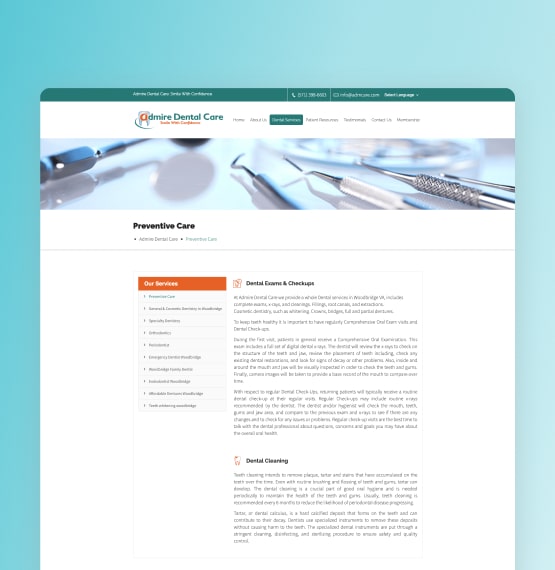 Admire Dental Care is a client that had their WordPress website developed by our team five years ago. They approached us with the objective of improving their website's overall performance and user experience. The primary goals were to increase website traffic through enhanced SEO strategies, improve mobile responsiveness, update content and images, integrate Google Maps and reviews, and introduce new functionalities like chat.